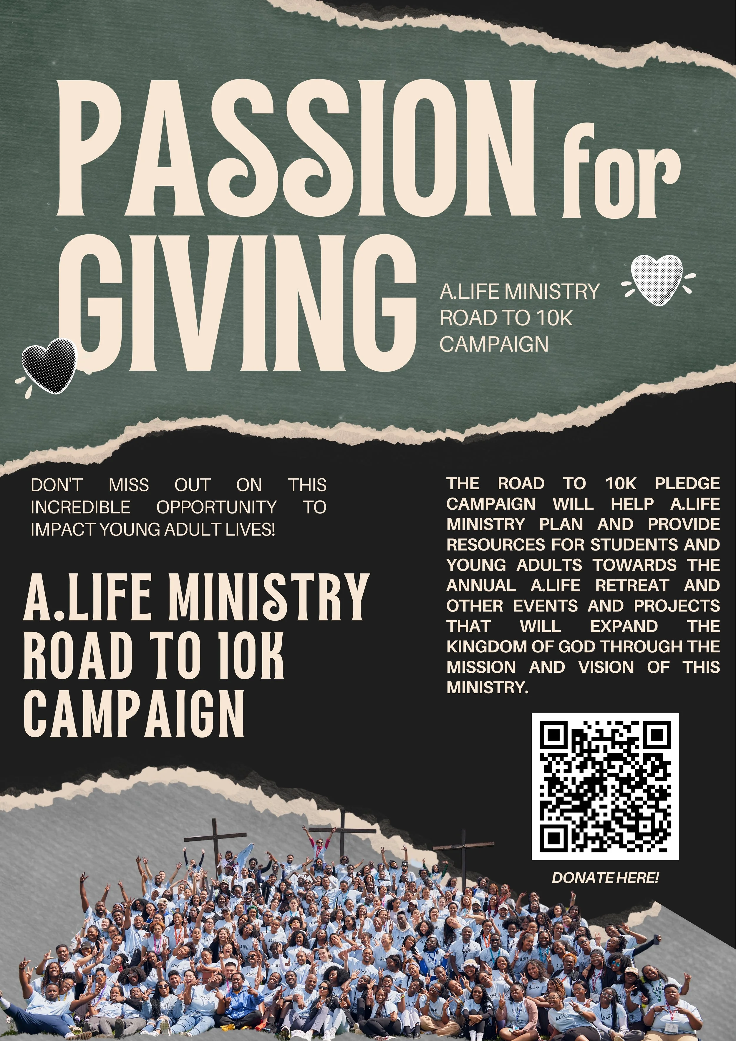 The Road to 10K pledge campaign will help A.LIFE Ministry plan and provide resources for students and young adults towards the annual A.LIFE Retreat and other projects that will expand the Kingdom of God through the mission and vision of this ministry.